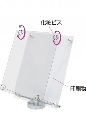アクリルと化粧ビスでポスターを挟み込んで展示する高級感ある卓上サイン