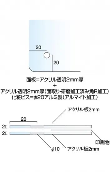 ●面板=前面:アクリル透明2mm厚(面取り・研磨加工済み・角R加工)背面:アクリル透明2mm厚(面取り・研磨加工済み・角R加工)