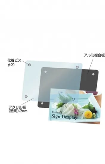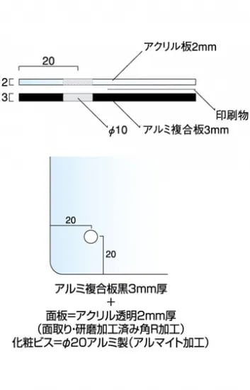 ●面板=前面:アクリル透明2mm厚(面取り・研磨加工済み・角R加工)背面:アルミ複合板黒3mm厚(面取り・角R加工)