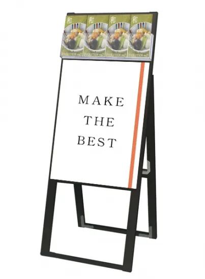 A4三つ折りパンフレットを配布できるケースが付いた横スライド式のスタンド看板