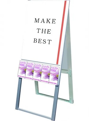 A4三つ折りパンフレットを配布できるケースが付いた横スライド式のスタンド看板