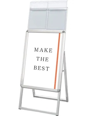 A4サイズのカタログを配布できるケースが付いた四辺開閉式のスタンド看板