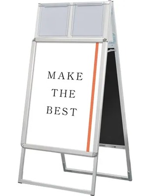 A4サイズのカタログを配布できるケースが付いた四辺開閉式のスタンド看板