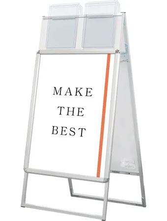 A4サイズのカタログを配布できるケースが付いた四辺開閉式のスタンド看板