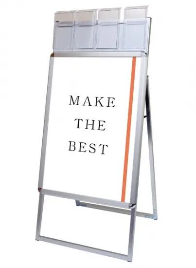 A4三つ折りパンフレットを配布できるケースが付いた四辺開閉式のスタンド看板