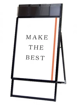 A4三つ折りパンフレットを配布できるケースが付いた四辺開閉式のスタンド看板
