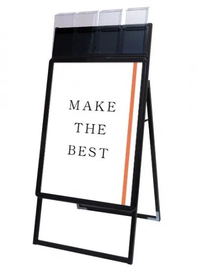 A4三つ折りパンフレットを配布できるケースが付いた四辺開閉式のスタンド看板