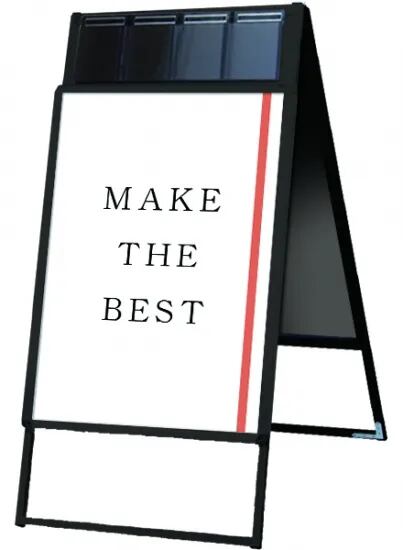A4三つ折りパンフレットを配布できるケースが付いた四辺開閉式のスタンド看板