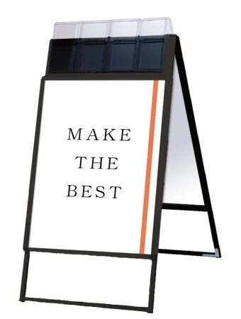 A4三つ折りパンフレットを配布できるケースが付いた四辺開閉式のスタンド看板
