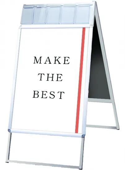 A4三つ折りパンフレットを配布できるケースが付いた四辺開閉式のスタンド看板