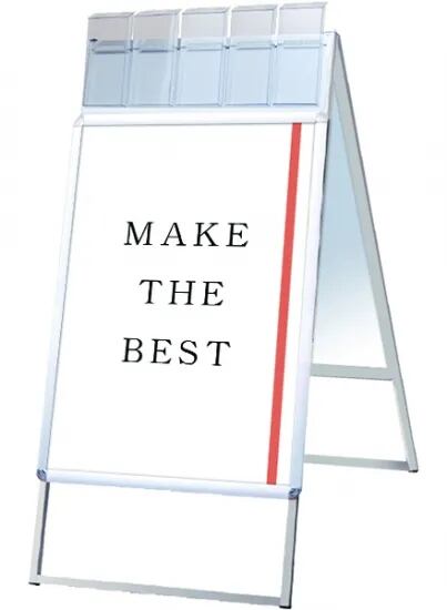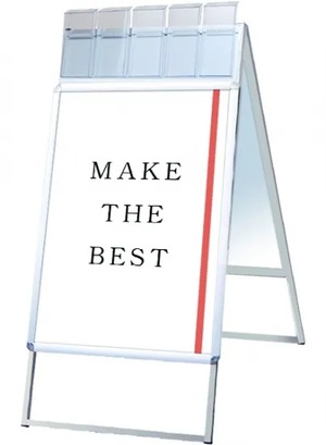 A4三つ折りパンフレットを配布できるケースが付いた四辺開閉式のスタンド看板